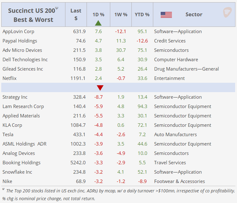 To monitor the performance of large-cap stocks, we use our universe: the top 200 stocks listed on U.S. exchanges by market capitalisation — including ADRs (i.e., leading foreign companies) — with a daily trading turnover over $100mn (i.e., liquid enough for retail investors). We include companies regardless of profitability or how long they’ve been publicly listed.