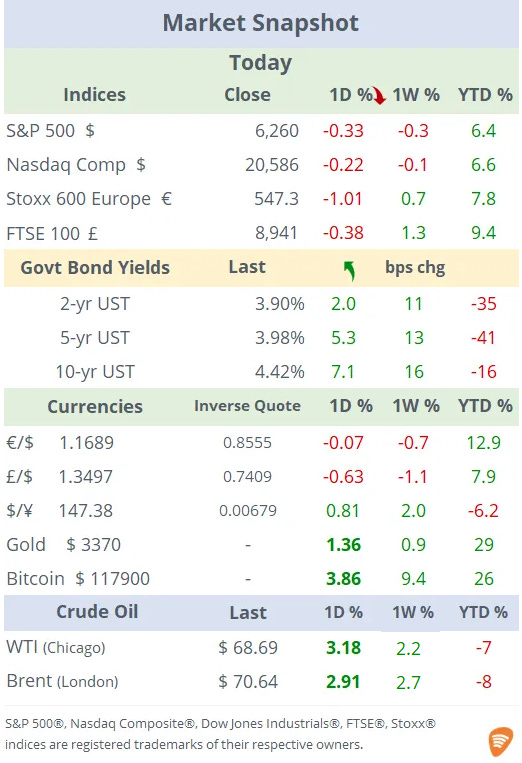 Lastly, the preliminary report on the Air India flight 171 plane crash investigation (by India’s Aircraft Accident Investigation Bureau), suggests the incident was caused by a fuel supply cut, with no current indication of fault attributed to Boeing or GE Aerospace, the engine manufacturer. The update was released before the US market open. Boeing shares gained 5% WTD and GE Aerospace 3.5%.