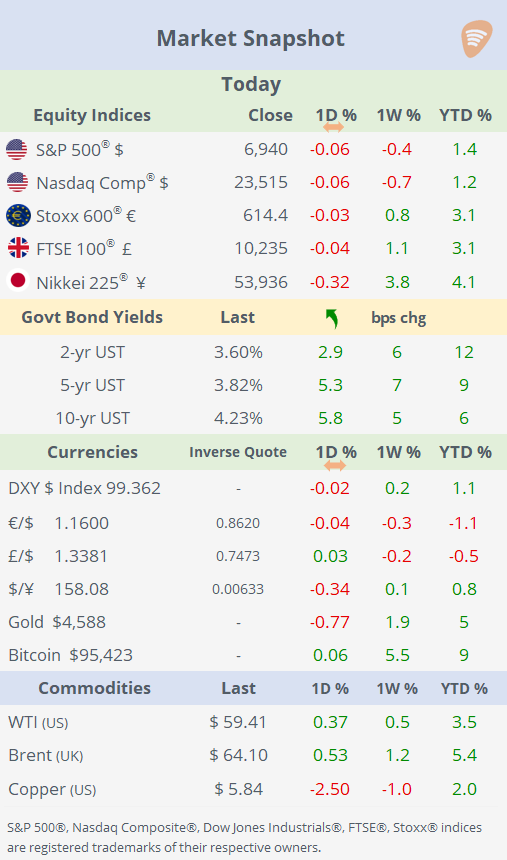 It was a light day on the data front, but there were some relevant comments from US central bankers. Fed Vice Chair Bowman said the Fed should remain prepared to cut rates if labour market conditions weaken, highlighting growing balance-of-risk considerations between inflation and employment. Separately, Vice Chair Jefferson noted that current monetary policy is well-positioned, supporting a near-term hold as inflation continues to ease and labour market conditions remain broadly stable. The Fed’s next meeting is on Jan 28th, and markets continue to price in an implied probability of 95% for a steady policy rate at 3.5-3.75%.