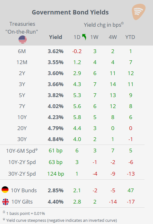 Equities and currencies were little changed on Friday as markets headed into Monday’s US stock and bond market holiday. Benchmark bond yields edged higher into the close, with the 10-year Treasury rising another 6bp to 4.23%, its highest level since early September, reflecting a continued repricing of rate expectations.