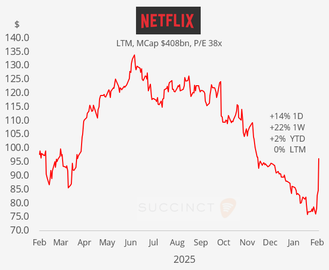Notable mover: → Netflix (mcap $405bn) shares rallied sharply (14%) today after it declined to raise its bid for Warner Bros. Discovery, effectively clearing the way for Paramount Skydance’s higher offer to prevail in the bidding war. After the close, Paramount announced it had entered into a definitive agreement to acquire Warner Bros. (THR)