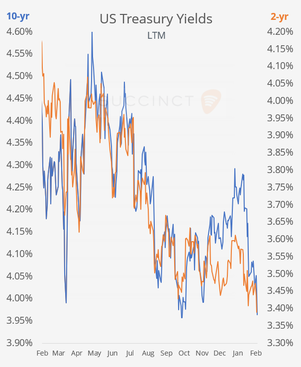 At the same time, geopolitical risk pushed oil prices higher as Washington-Tehran nuclear talks ended without a deal, while the risk-off move lifted bonds, sending 2-year Treasury yields (3.39%) to their lowest since August 2022, and reignited safe-haven demand, with gold and silver rallying sharply, silver jumping 7%. Long-end Treasury yields plunged ~30bp in February.