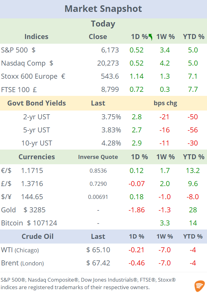 Markets posted another strong day with leading indices advancing 0.5% to a fresh record high and Europe rallying over 1.5%. Nasdaq indicators gained 4.2% WTD while Germany´s Dax added 3%. The S&P 500 has rebounded 28% from its lows following the Liberation Day sell-off.
