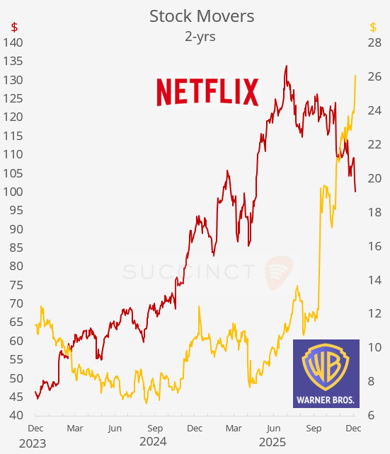 Netflix has secured a $59bn bridge loan from Wall Street banks to help fund the transaction, marking one of the largest debt financings ever for an M&A deal. WBD shares rose over 6% (+147% YTD) while Netflix fell 3% today (+12% YTD).