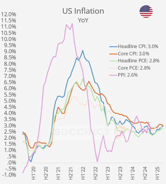 Data: → US headline PCE inflation rose 2.8% YoY in September (delayed release due to the shutdown), indicating headline inflation remains elevated but relatively stable. The core PCE (excluding food & energy) also came in at 2.8%, marking a slight deceleration from 2.9% in August — the first core slowdown since April. The data keeps inflation modestly above the Fed’s target, but supports high odds that markets will price in a rate cut at the meeting next week. The market odds for a quarter-point rate cut remain at 87%.