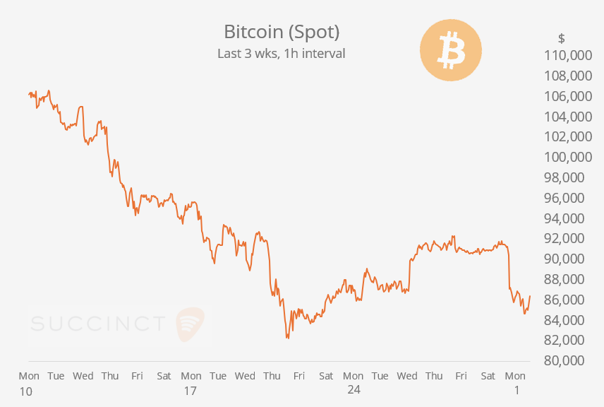 The crypto complex dominated headlines today as Bitcoin dropped 6% to ~86,000 in its sharpest decline since March, touching an intraday low near 84,000 after last week’s partial rebound.