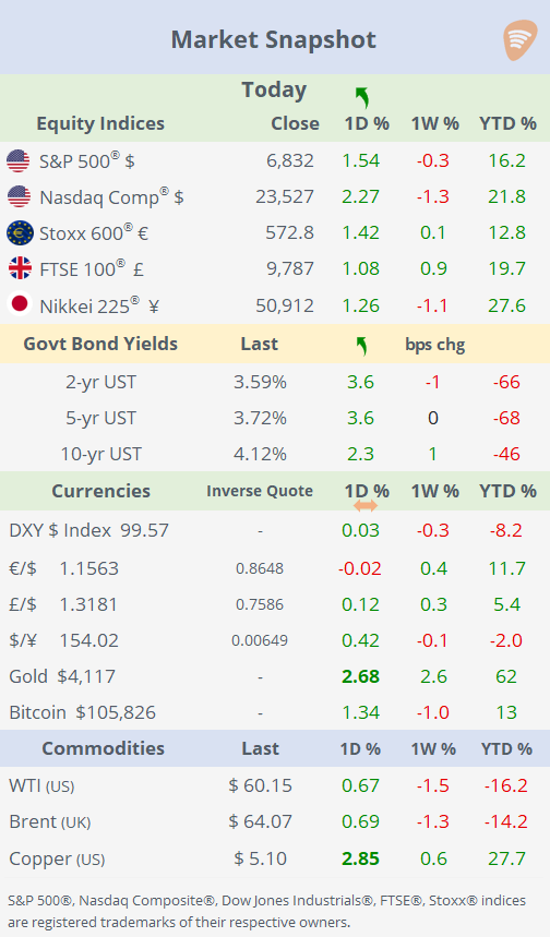 Renewed interest in AI-related stocks drove markets higher, with Nvidia up nearly 6% and Palantir gaining 9%. The rally in mega-cap tech led to a clear outperformance of the market-cap weighted S&P 500 (+1.5%) compared with its equal-weight version (+0.6%). The Nasdaq Composite gained over 2% today and recovered 4% from its Friday intraday low when a weak consumer confidence print triggered a selloff.
