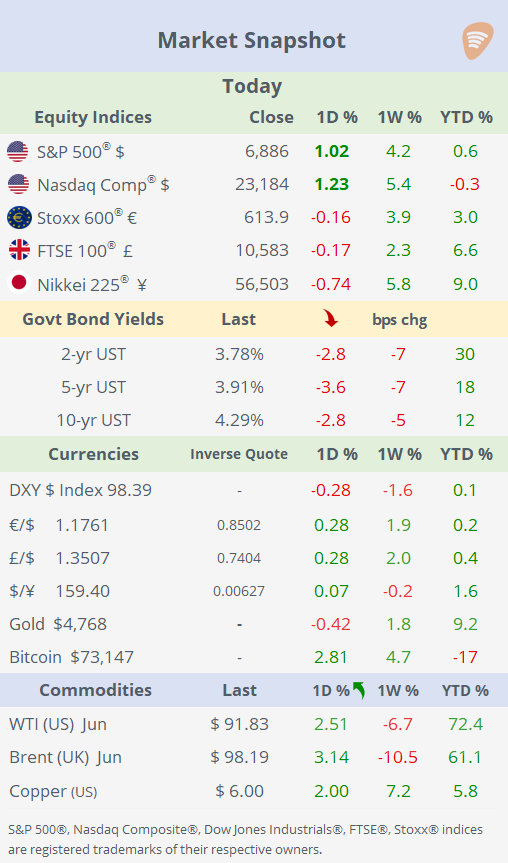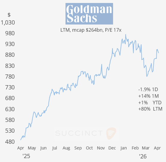 Earnings: → Goldman Sachs reported a strong Q1, with profit rising 19% to $17.55/share (above estimates) and revenue up 14% to $17.23bn, driven by record banking & markets revenue, a 48% jump in investment-banking fees, and solid trading activity. However, shares fell 2% on the day as strong backwards-looking results were overshadowed by management caution that the Iran conflict and elevated uncertainty could slow IPOs, M&A and broader Wall Street activity later this year. The Q1 earnings season officially starts tomorrow with other mega-banks reporting. (CNBC)