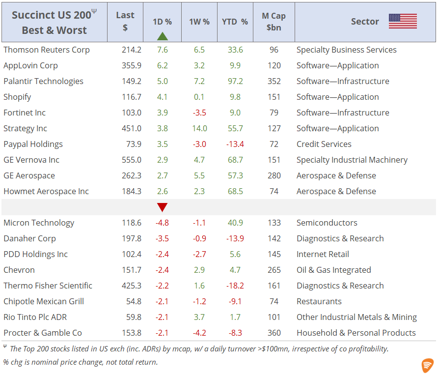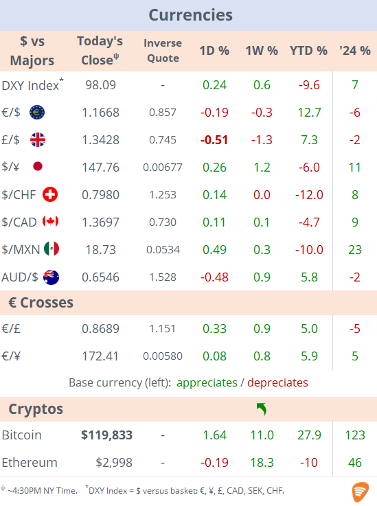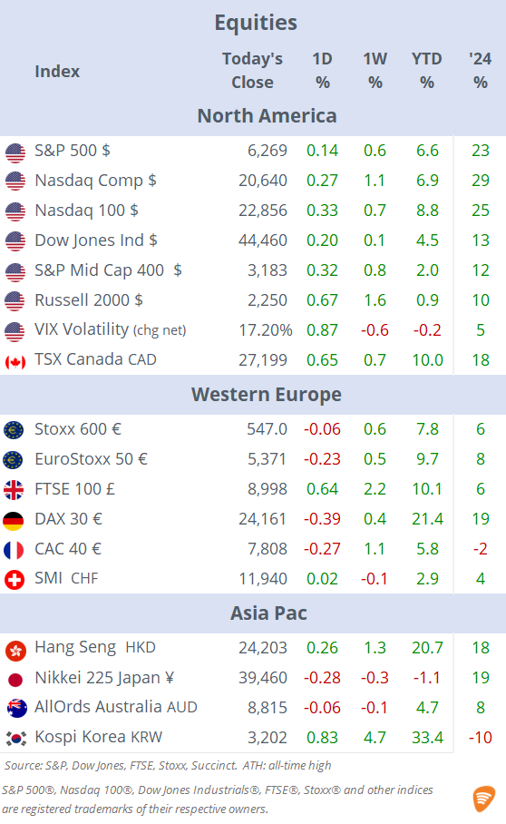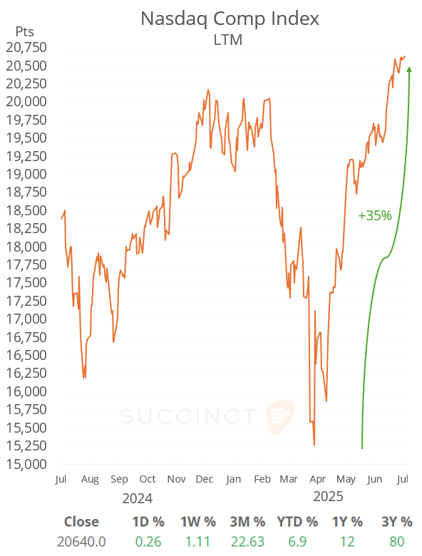 Mon 14 Jul: Market DataTables & ChartsU.S. Markets DailyJul 14, 2025ShareSubscribeCopyright © 2025 Succinct.S&P 500®, Nasdaq 100®, Dow Jones Industrials®, FTSE®, Stoxx® and other indices are registered trademarks of their respective owners.