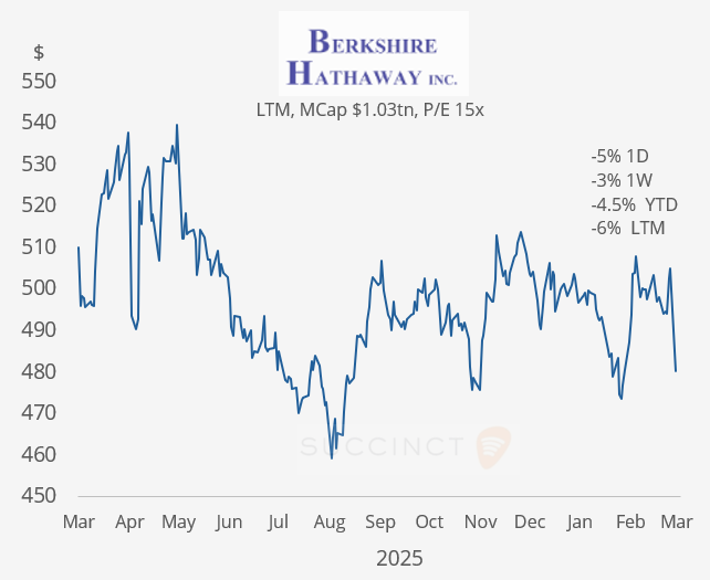 Earnings: → Berkshire Hathaway reported on Saturday, and shares fell 5% today as Q4 results missed expectations, with operating profit down ~30% and insurance underwriting income off more than 50%, signalling tougher conditions in core P&C. While Greg Abel struck the right tone in his first shareholder letter, there was no change in capital allocation—no buybacks, no dividend signal. Cash hit a record $373bn, reinforcing the market’s concern about near-term returns absent a major acquisition or valuation reset. Shares are 4% lower YTD and -6% in the LTM.