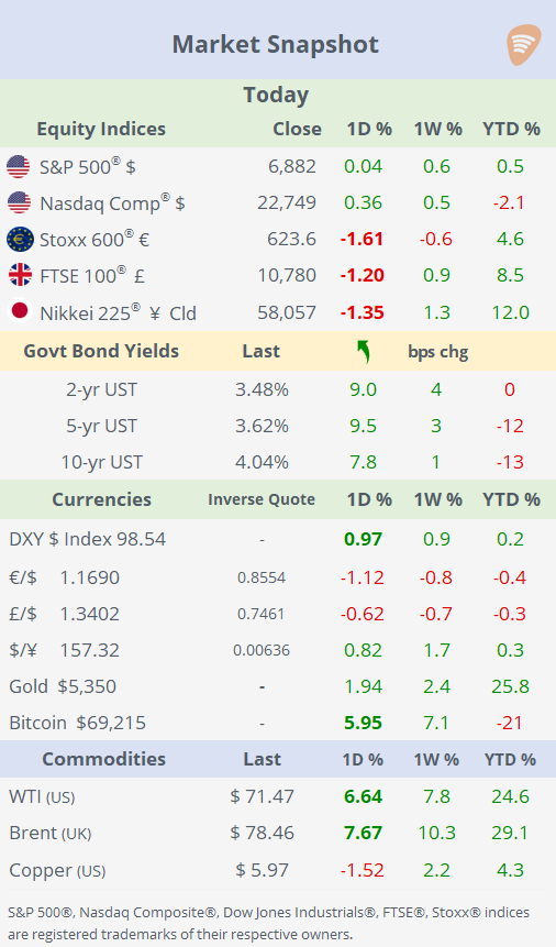 European and Asian markets largely sold off, with airlines among the hardest hit, while other risk assets such as Bitcoin posted gains. Brent crude surged 7.7%, its largest one-day move since June, on fears of prolonged disruptions to the Strait of Hormuz and escalating attacks on regional energy infrastructure.