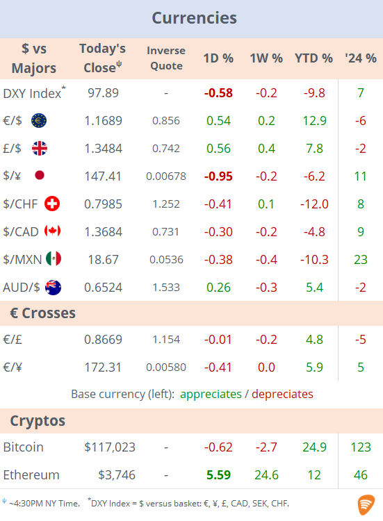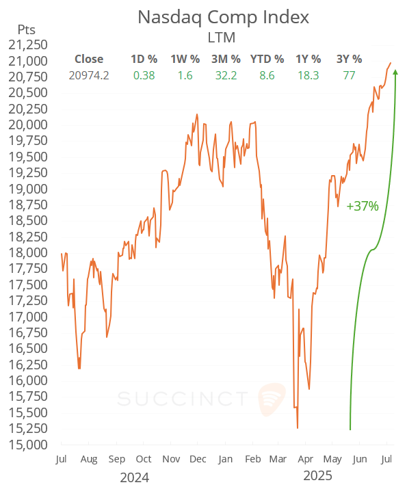 Mon 21 Jul: Market DataTables & ChartsU.S. Markets DailyJul 21, 2025ShareCopyright © 2025 Succinct.S&P 500®, Nasdaq 100®, Dow Jones Industrials®, FTSE®, Stoxx® and other indices are registered trademarks of their respective owners.