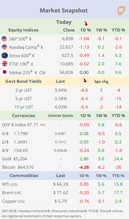 Stocks tumbled as markets digested renewed trade uncertainty following Trump’s decision to raise global tariffs, alongside growing concerns about AI-driven disruption across multiple industries. The financial sector underperformed, dragging benchmarks lower as American Express, Visa, Mastercard, Goldman Sachs, and JPMorgan posted steep declines. Software names were hit again after a report from Citrini Research reignited fears over the economic impact of AI, with Microsoft, CrowdStrike, AppLovin, and Intuit all coming under renewed pressure.