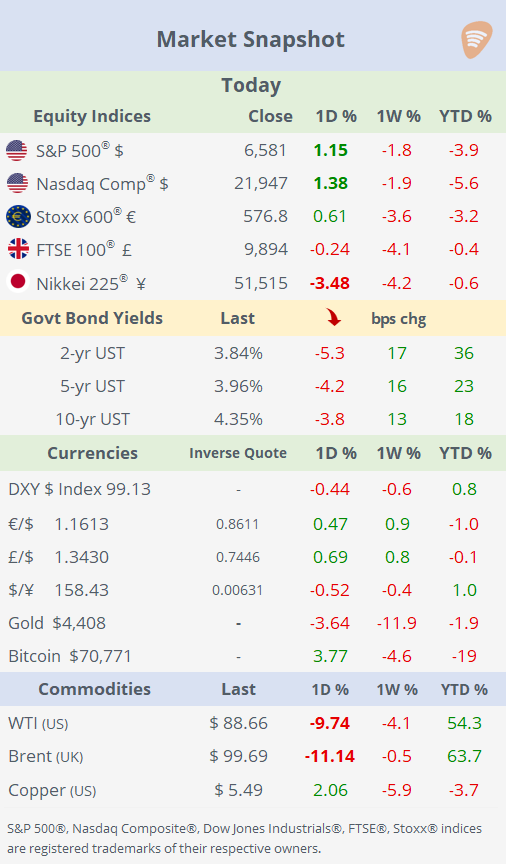Markets reacted with a classic relief rally: crude oil plunged more than 10% as fears of supply disruption eased, equities rallied across the US and Europe (after earlier weakness in Asia, particularly Korea), and bond yields edged lower by a few basis points.