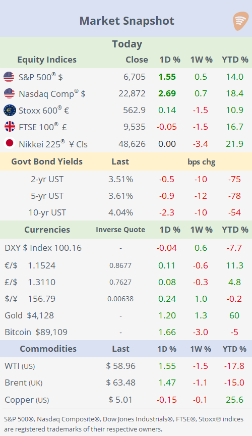 IT mega caps rallied today, with the chip sector and AI-related names driving gains. The Philly Semiconductor Index rose nearly 5% and is now 33% higher YTD. The Nasdaq Composite recorded its best day in over six months, while Alphabet shares jumped 6.3% on optimism around its AI model Gemini 3, launched last week. Tesla and Broadcom also contributed to the tech rally.
