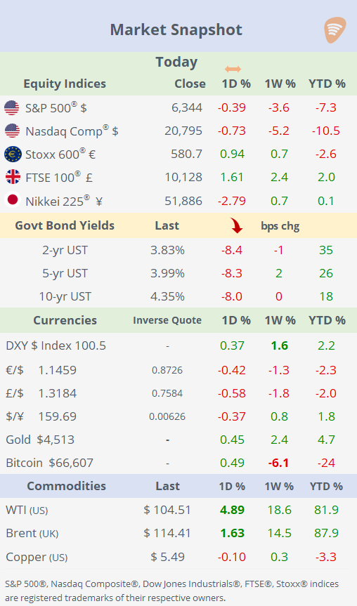 Another weak session to start the week, driven by higher oil prices, conflicting signals on the Middle East conflict and cautious messaging from central banks. WTI oil rose ~5% on the day, extending its weekly rally to +18%, as Trump oscillated between signaling diplomatic progress with Iran and renewing threats of strikes on energy infrastructure, keeping markets on edge. Equities on Wall Street declined globally, with the Nasdaq Composite now firmly in correction territory, while IT and industrials led losses and financials outperformed.