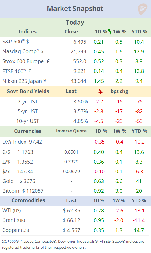 Stocks and bonds kicked off the week on a positive note, with major indices climbing around 0.4%, including the Nasdaq hitting an intraday record high. Benchmark 10-year Treasuries fell to a five-month low of 4.05% after a strong four-day rally fueled by growing expectations of faster Fed policy easing following the poor employment report on Friday.