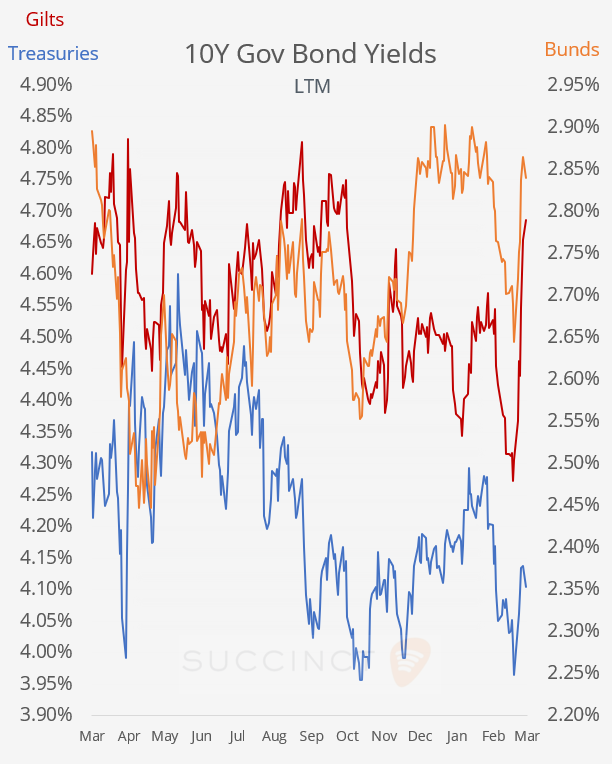 In rates markets, war-driven inflation fears triggered a sell-off in global bonds, with debt assets posting their worst week since October 2024 as traders unwind bets on interest rate cuts. UK gilts have been hit hardest, suffering their worst week since the 2022 pension crisis and pushing the 10-year yield to 4.68%.