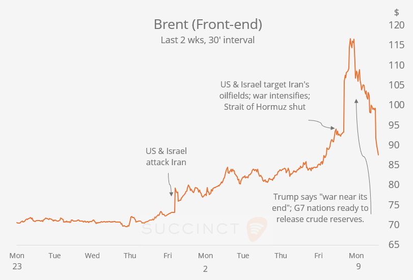 Markets experienced extreme volatility on Monday, driven primarily by dramatic swings in oil prices amid fast-moving developments in the Middle East conflict. Brent crude surged as much as 28% at the open to $119 per barrel following escalating strikes between the US, Israel and Iran over the weekend, but later reversed sharply to close near $90 after comments from Trump suggesting the war could be nearing its conclusion.