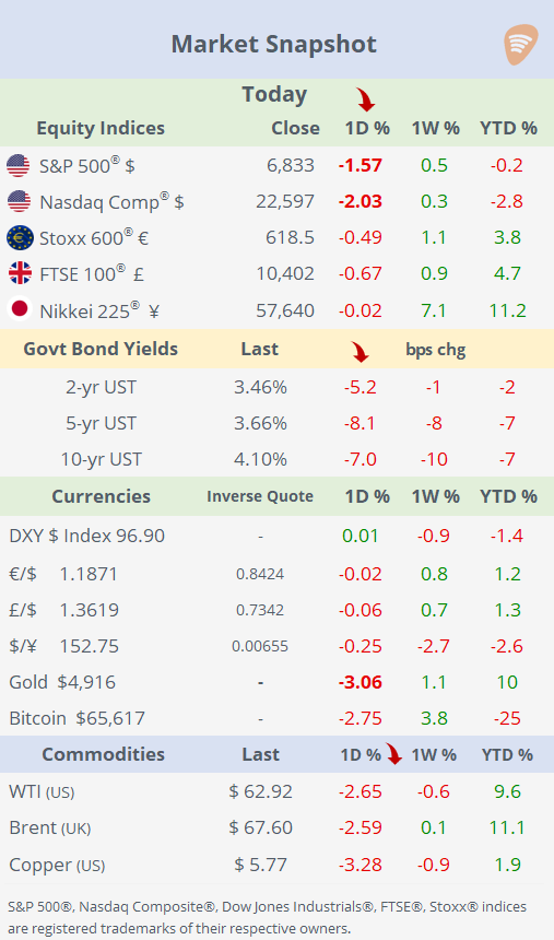 Beyond equities, Treasuries rallied sharply, with the 10-year yield falling 7bp to 4.10%, its lowest close since early December, as investors sought safety; gold and silver weakened, the dollar was broadly steady, and crypto assets extended their slide, with Bitcoin nearing $65,000 after four consecutive days of losses. Attention now turns squarely to Friday’s inflation data as the next catalyst for rates and risk sentiment.
