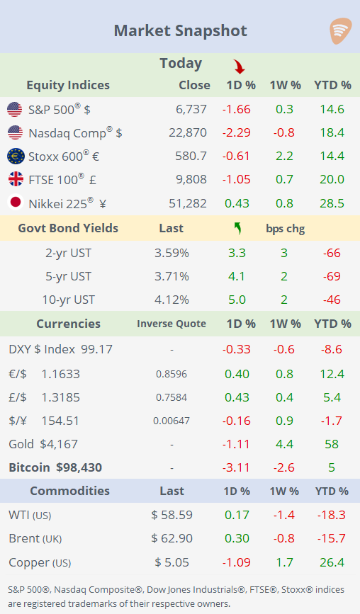Markets plunged on Thursday, as a sharp equity sell-off was fueled by growing concerns over lofty AI-driven valuations and a repricing of interest-rate expectations. Investors continued to unload major technology names, particularly those tied to the artificial-intelligence trade, amid worries about stretched multiples and surging capital-expenditure plans.