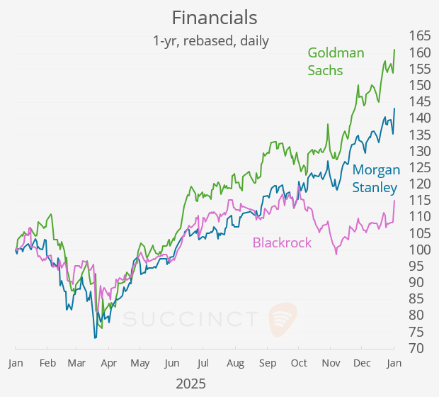 → Goldman Sachs (+4%), Morgan Stanley (+6%) and BlackRock all beat Q4 earnings expectations, driving significant upside in their stock prices as broader financials rebounded. Goldman and Morgan Stanley saw double-digit profit increases underpinned by strong investment banking fees, record trading revenues and solid wealth management results, reflecting healthy dealmaking and market activity. BlackRock’s shares jumped 6% on better-than-expected revenue growth, robust net inflows and rising assets under management, highlighting continued strength in the asset-management complex. The strong results contrast with earlier bank disappointments this week and shifted sentiment toward optimism on financial earnings and capital markets momentum.