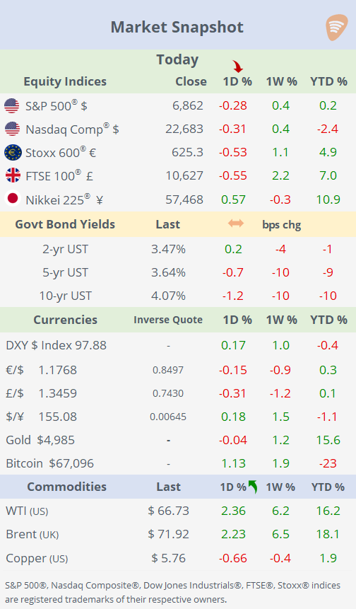 Markets turned risk-averse as heightened geopolitical tensions, mixed corporate earnings, and a negative headline in private credit weighed on sentiment, pushing equities lower across both the US and Europe. Energy was the clear outlier, with oil rallying again on rising Middle East risk, while bond yields were little changed and the $ climbed to a four-week high. Notably, gold showed only a muted response despite the Iran-related headlines, suggesting positioning fatigue rather than a full-blown flight to safety.