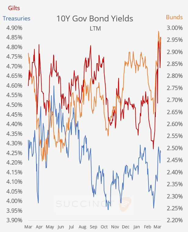 At the same time, central banks added another layer of complexity. Yesterday, the Fed; today, the ECB, Bank of England, Bank of Japan, and Swiss National Bank, all highlighted rising inflation risks tied to energy prices, reinforcing concerns that a prolonged shock could delay or even reverse the path toward rate cuts. Bond markets reacted accordingly, with yields spiking; 2-year Treasuries briefly approached 4% (up 32 bp in the past 4 weeks) before retracing into the close.