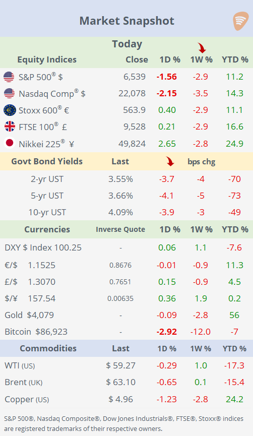 Treasury yields eased by roughly 4bp across the curve, with the 2-year closing at 3.55%. Risk aversion hit digital assets hard: Bitcoin and Ethereum each fell more than 3% again, with Bitcoin sliding to $86,680, its lowest level since April, leaving it 31% below its October peak and 22% under its 200-day moving average. Despite the turbulence, gold and the $ index were largely unchanged.