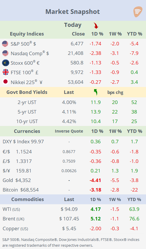 Fixed income also came under pressure, with the 2-year Treasury yield climbing back toward 4%, its highest level since June, reflecting a sharp repricing of inflation and rate expectations as higher oil prices feed through the macro-outlook. Overall, the session was defined by broad-based declines across equities, bonds, precious metals and cryptos, underscoring a market driven by uncertainty, policy risk, and energy-driven inflation fears.