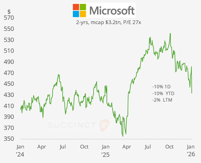 Risk assets sold off sharply in a volatile session, led by Microsoft, which slid 10% (worst day since ‘20 and erasing $400bn of value) despite beating revenue and profit expectations, as investors focused on slowing cloud momentum and surging AI-related capital spending. While Azure (cloud) revenues topped $50bn for the first time, guidance and cost intensity reignited concerns that AI monetisation may lag heavy upfront investment, with CEO Satya Nadella warning that payback will take time, dragging the broader tech complex lower, including Salesforce, ServiceNow and Workday.