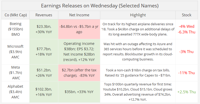 → Apple and Amazon reported after the bell, with Amazon beating on most estimates as AWS revenues grew 20% YoY, but it missed on operating margins. The stock rallied 11% in extended hours. Apple also reported in line but missed marginally on iPhone and China sales. The stock traded sideways to modestly positive. Overall sentiment after the bell was positive.