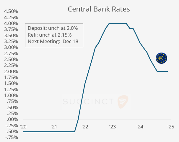 Monetary Policy: → The ECB kept all its benchmark interest rates steady as expected, with the deposit rate at 2.0%, the refinancing rate at 2.15% and the marginal lending facility rate at 2.4%.