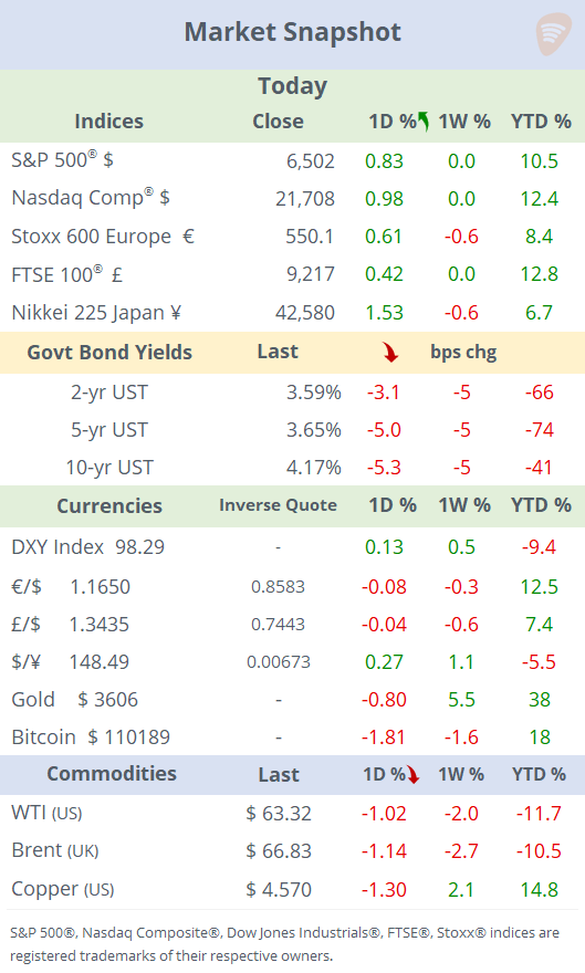 Stocks and bonds edged higher in another solid day for risk, as softer labour data and dovish remarks from Fed’s Williams reinforced expectations of upcoming rate cuts. Equities recovered to near record highs despite Trump’s warning that a Supreme Court ruling against tariffs could cause economic damage. Equity indices gained ~0.8%, 10-year Treasury yields fell another 5bp to 4.17%, the lowest close since late April, the $ closed a touch firmer, while crude oil and cryptos fell. All eyes are on tomorrow’s employment report ahead of the Fed policy meeting in two weeks.