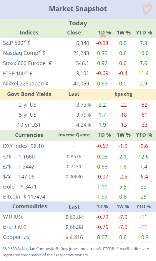 US equities finished mixed on Thursday as Trump’s tariffs on dozens of trade partners, ranging from 10% to 50%, took effect. The average import levy now stands at 18.6%, the highest since 1933. The Nasdaq Composite closed at a fresh record high after Trump suggested that Big Tech may be exempted from his proposed 100% duty on semiconductors. Healthcare was the worst-performing sector, weighed down by Eli Lilly’s sharp selloff after reporting.