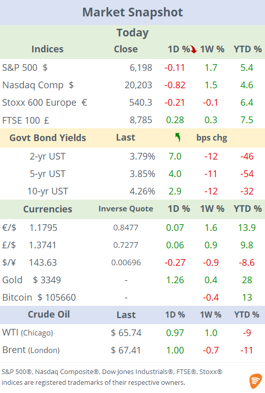 Earnings: Constellation Brands (STZ, mcap $30bn, Corona and Modelo beers) reported after the close and missed sales ($2.52bn, -6% YoY) and profit ($516mn, -12% YoY) estimates, on lower beer demand and higher aluminium costs due to tariffs. Despite the quarterly miss, the co maintained its full-year adjusted EPS guidance. Shares traded flat in after hours following a 2.3% gain during the session.
