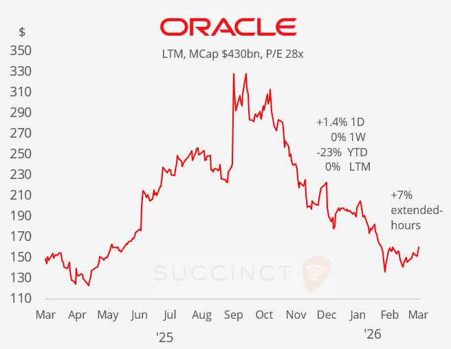 Earnings: → After the close, Oracle (mcap $430bn) beat Q3 expectations with EPS of $1.79 on $17.19bn in revenue (vs. $1.70 and $16.9bn expected), driven by stronger-than-forecast cloud infrastructure sales. The company also raised its 2027 revenue outlook to $90bn, sending the stock ~7% higher in after-hours trading as investors focused on accelerating cloud growth and heavy AI-related capex. Shares are 23% lower YTD and flat in the LTM.