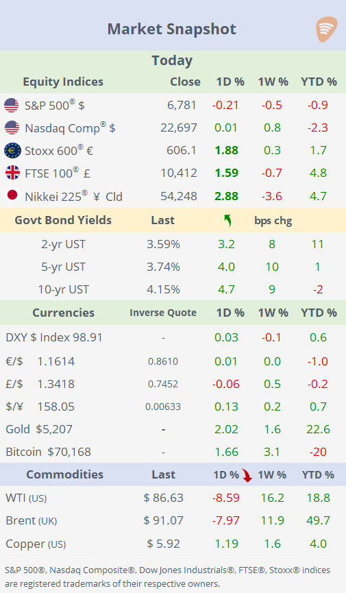 Elsewhere, currency markets were quiet, Treasury yields moved modestly higher, while gold jumped around 2% to about $5,207, and Bitcoin hovered near $70,000.