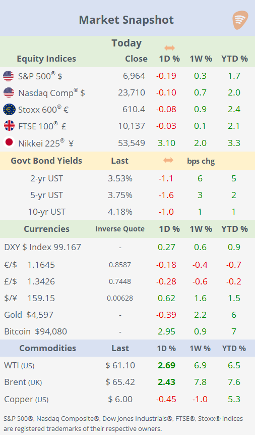 Tuesday marked the kick-off to the quarterly earnings season alongside the latest US CPI inflation release, but neither provided much upside impetus for markets. Most data and results were broadly in line to slightly disappointing, leaving equities trading sideways to modestly lower through the session. December inflation data reinforced expectations for a Fed rate pause, with the implied probability of no policy change at the late-January meeting rising to 97% from 82% a week ago.