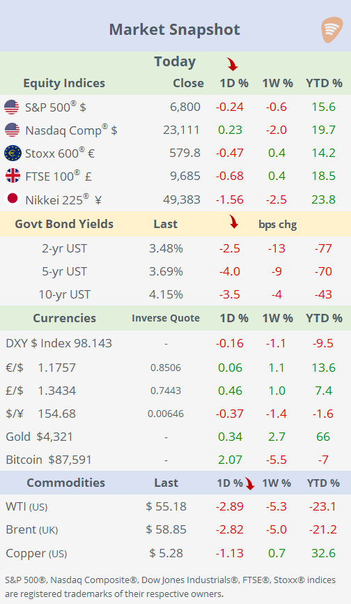 The widely anticipated November jobs report reinforced signs of a softening US labour market, though it did little to alter market expectations for another Fed rate cut in late January. Bond markets reacted more clearly, with core yields falling 3–4bp across the curve, extending the weekly decline to about 13bp at the short end and 4bp on the 10-year Treasury, resulting in further curve steepening.