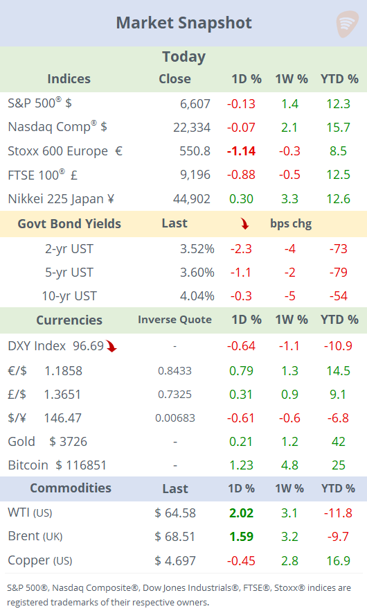 The $ index fell to its lowest level since early July, mainly against the € and Swiss Franc and accumulated an 11% depreciation this year. Gold surged past $3,700 for the first time, fueled by Fed rate-cut optimism and a weaker $ and is already 41% higher YTD.
