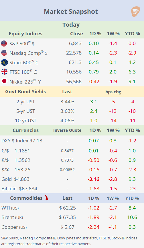 In geopolitics, the US and Iran reported progress in indirect nuclear talks in Geneva, agreeing on a set of “guiding principles” that both sides described as serious and constructive, easing some regional pressure, a dynamic that helped Brent oil fall ~2% as traders priced in lower immediate conflict risk.