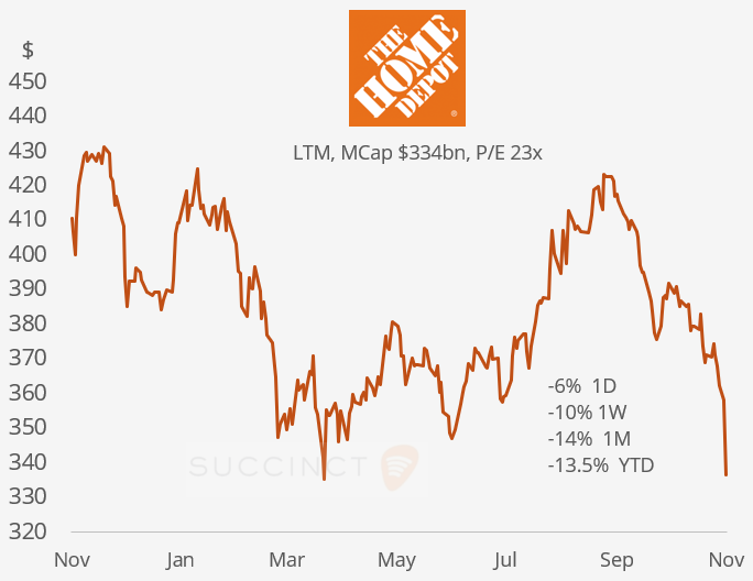 Earnings: → Home Depot (mcap $343bn) reported Q3 fiscal 2025 revenue of $41.4bn (up 2.8% YoY) above estimates, but its adjusted earnings figure ($3.74) missed expectations, and the company trimmed its full-year outlook, citing weak housing demand, consumer uncertainty and lack of storm-driven volumes. The stock fell over 5% (-13% YTD) as investors reacted to the net profit miss and weaker guidance despite the revenue beat. It was today’s worst performer on the Dow index.