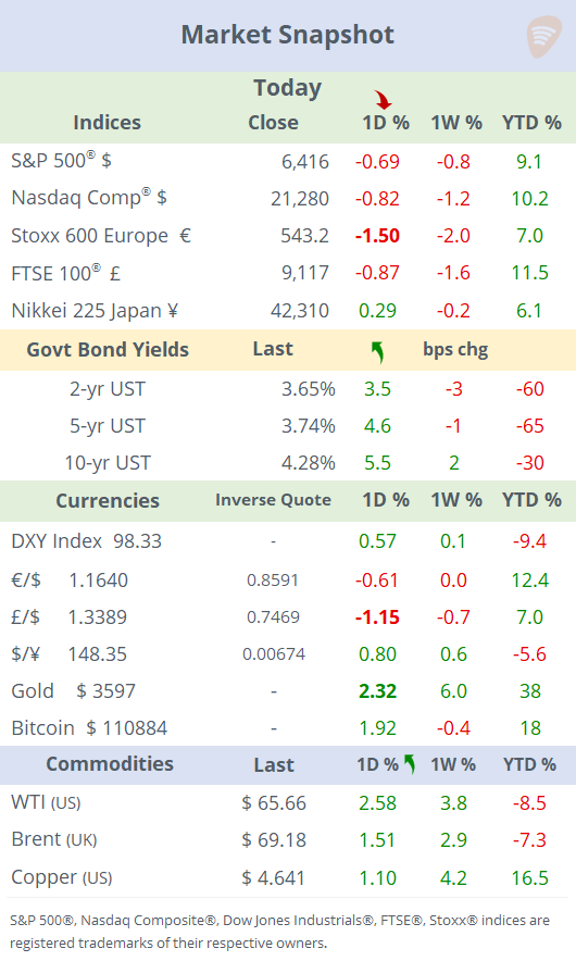 European bond markets sold off on Tuesday with 30-year British Gilts yields rising 6bp to 5.70% (and +53bp YTD), the highest since 1998, driven by persistent inflation and rising public debt. The UK’s borrowing costs are the highest among G7 nations, adding pressure on the Chancellor ahead of the Autumn Budget. Britain’s inflation in July, released two weeks ago, accelerated to 3.8% YoY, the highest in 19 months. The Bank of England meets on September 18, and markets are pricing in a 90% chance for rates to remain steady at 4%. In currency markets, sterling plunged over 1% today to a four-week low.