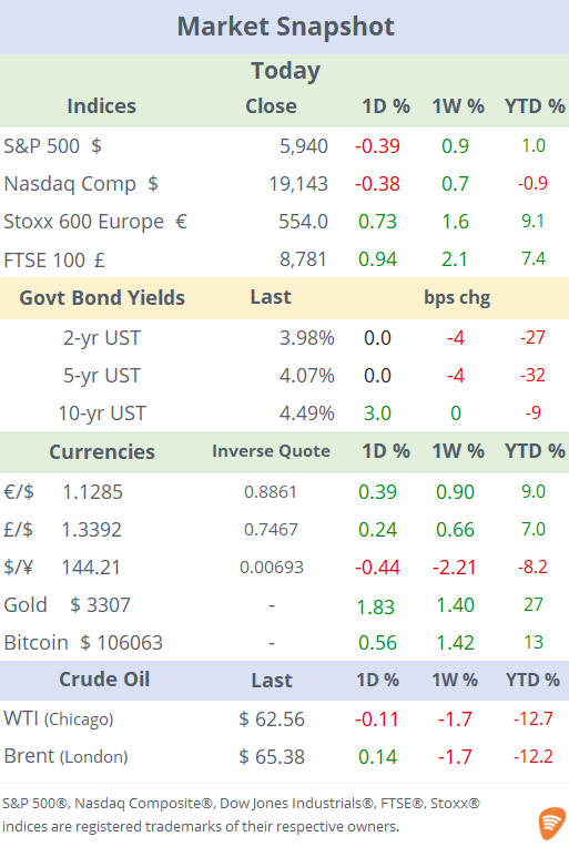 US equity indices dropped for the first time in six days, mostly on slightly weaker prices for Big Tech stocks. All three leading benchmarks ended 0.4% lower on the day after a late session recovery from the day’s low. European and Asian stocks gained ~1% on Tuesday.