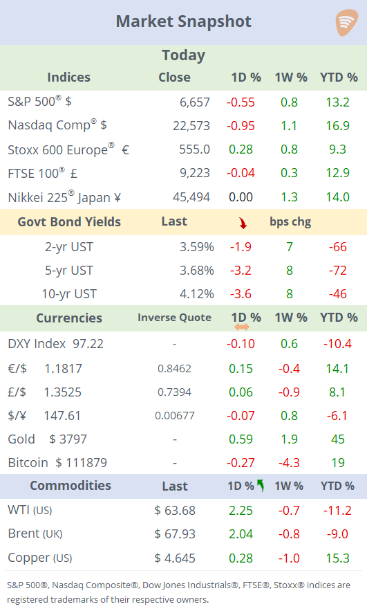 U.S. stocks pulled back Tuesday, with major indices snapping their recent rally as doubts over the durability of the artificial intelligence trade weighed on sentiment. Heavyweights Nvidia and Oracle, key drivers of this year’s AI boom, dropped over 3%, while Fed Chair Jerome Powell added to valuation concerns at a speech. The Vix index jumped to 17%, the highest level in three weeks, before reversing slightly. Traders also kept an eye on rising risks of a government shutdown ahead of the September 30 funding deadline. In markets, currencies and gold were little changed, core bond yields fell a few basis points, and oil jumped on stalled Kurdish exports and Trump’s call for Europe to halt Russian energy purchases.