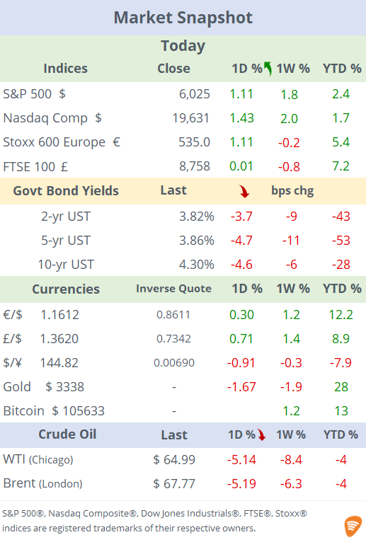 US equity indices rallied between 1 and 1.5% and are nearing their all-time highs a 26% rally for the S&P 500 from its level at the bottom of the tariffs sell-off on April 8 triggered by Liberation Day. Crude oil continues to fall sharply with another 5% decline today and Brent is now trading well below the $70 mark, a two-week low.