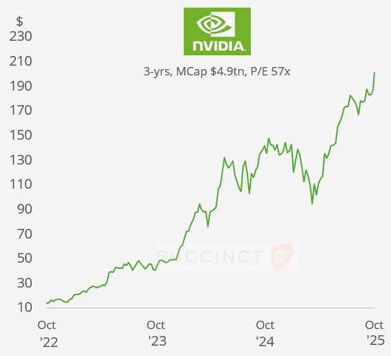 → Nokia (mcap $42bn) announced that Nvidia will invest $1bn in the Finnish telecom equipment maker, marking a major strategic partnership aimed at accelerating the development of AI-powered network solutions. Nokia shares jumped 23% in New York to a 10-year high and have gained 79% YTD.