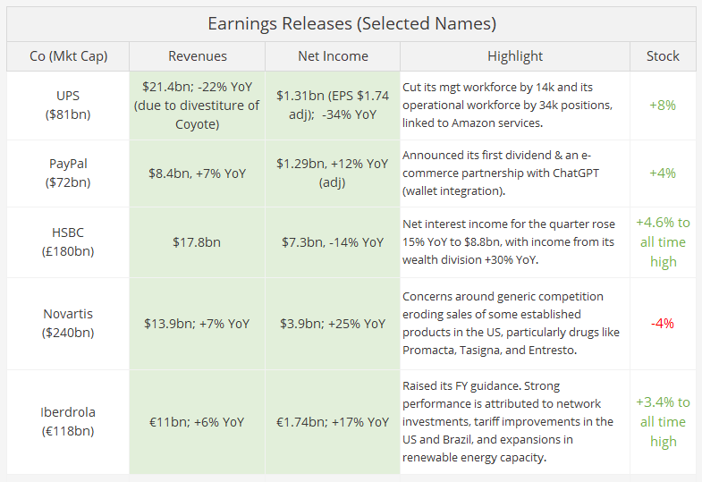 Earnings: Pre-market open releases and those in Europe were mostly positive, but after the US close, Mondelez (mcap $78bn) missed on diluted EPS and cut its full-year profit forecast, sending shares down by 4% in extended trading. Visa and Booking Holdings beat top and bottom estimates.