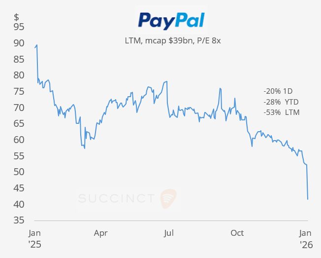 Earnings: → Were mixed today: PayPal shares plunged 20% after Q4 earnings missed top and bottom estimates ($8.7bn revenue) with weak 2026 profit guidance and a CEO transition announced. Shares are down 29% YTD and lost 53% in the LTM.
